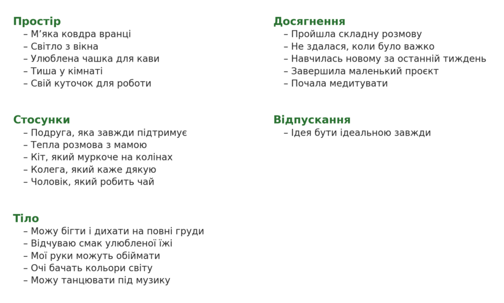 Наш мозок налаштований помічати те, на що ми свідомо спрямовуємо увагу. Ця вправа буквально “перенавчає” вашу увагу фокусуватися на тому, що вже є, замість того, чого бракує.